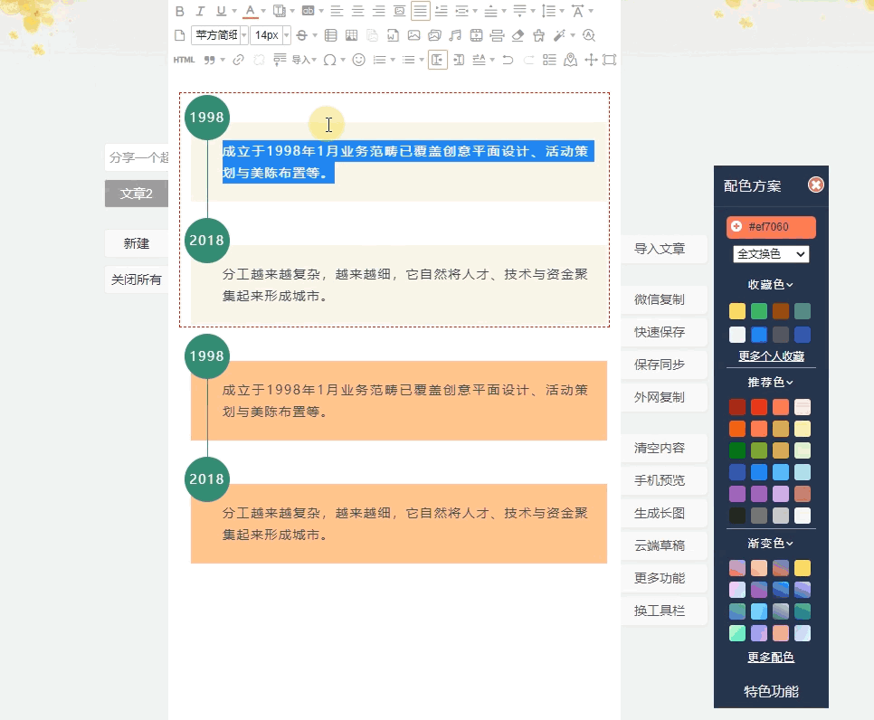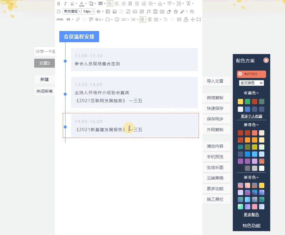 遇到這種文字段落很多的文章,樣式用得太多,配色不統(tǒng)一就會(huì)顯得花里胡哨。三兒教大家一個(gè)小技巧,使用時(shí)間軸/分欄樣式,既不會(huì)顯得單調(diào),又能讓整個(gè)版面看起來清晰有條理。