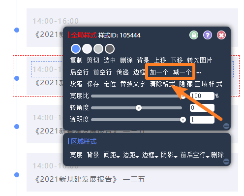 在原樣式的基礎(chǔ)上,如果需要添加或者減少時(shí)間軸的欄目,可以在全局設(shè)置中選擇【加一個(gè)】或者【減一個(gè)】來調(diào)整。