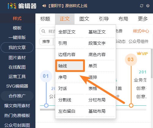 在左側(cè)樣式中心的【正文】-【軸線】分類下就能找到各種類型的時(shí)間軸和分欄。