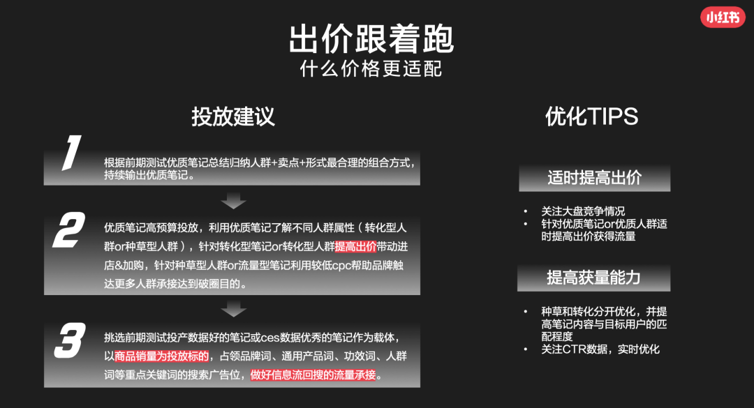 總結(jié)下:需要有KOL合作筆記作為標的來進行投放才可以,兩種類型的筆記可以承擔不同的作用,例如針對轉(zhuǎn)化類的筆記可以提高出價,以此占據(jù)更有利的位置帶動轉(zhuǎn)化。而種草類的屬于擴散型,未必能直接帶來用戶的購買,所以使用較低的成本來去投放,意思能影響多少算多少,屬于愿者上鉤,不強求。