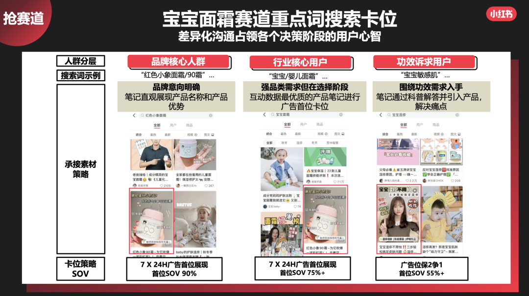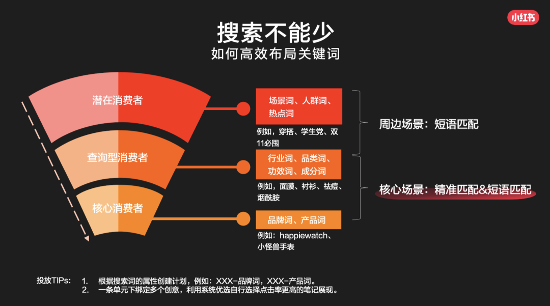小紅書的意見是細分在細分,根據(jù)不同的場景,行業(yè),產(chǎn)品來分別擊中不同的消費者。(但其實往往分的這么細的情況下,用戶精準是精準了,但必須得做個測試,因為很多太精準的詞可能沒流量,消耗不完也說不定,錢省了,效果是0,但雙11可過去了兄弟們。)