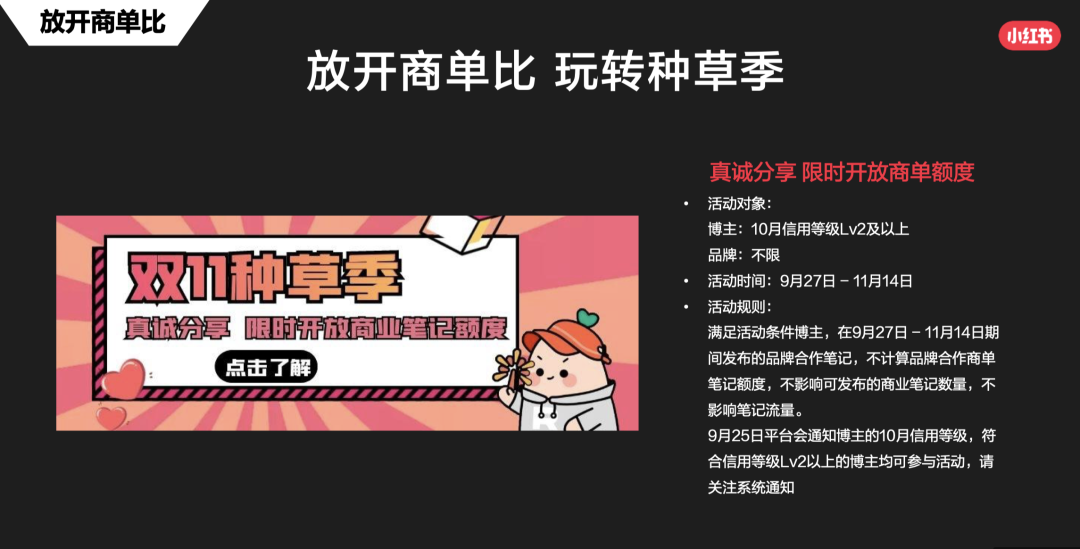 所以大家務必注意把控時間,尤其電商節(jié)點,時間等于金錢,還是找機構(gòu)合作比較順暢。(可以關注“麋鹿先生sky”公眾號,回復“小紅書雙11”領取ppt原版)