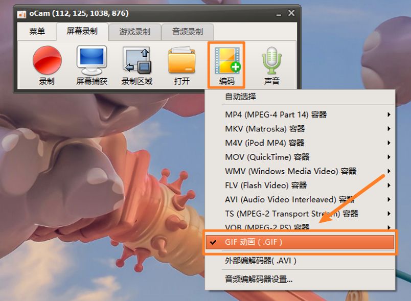 ● 打開錄屏軟件oCam,在【編碼】中選擇【GIF動畫】選項;