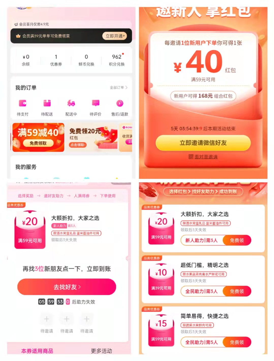 除投放及自然流量外,每日優(yōu)鮮也同樣有一些老帶新活動(dòng)、裂變助力活動(dòng)
