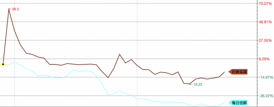 每日優(yōu)鮮與叮咚買菜股價(jià)走勢(shì)對(duì)比:
