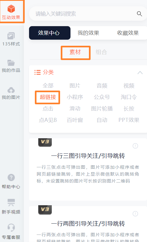 進(jìn)入網(wǎng)頁后,選擇互動(dòng)效果-素材-超鏈接,找到『一行三圖引導(dǎo)關(guān)注/引導(dǎo)跳轉(zhuǎn)』效果(ID:135)或『一行兩圖引導(dǎo)關(guān)注/引導(dǎo)跳轉(zhuǎn)』效果(ID:134)即可使用(根據(jù)你要添加的跳轉(zhuǎn)數(shù)量來定,如果是四個(gè)跳轉(zhuǎn),那可以用兩個(gè)一行兩圖的)。