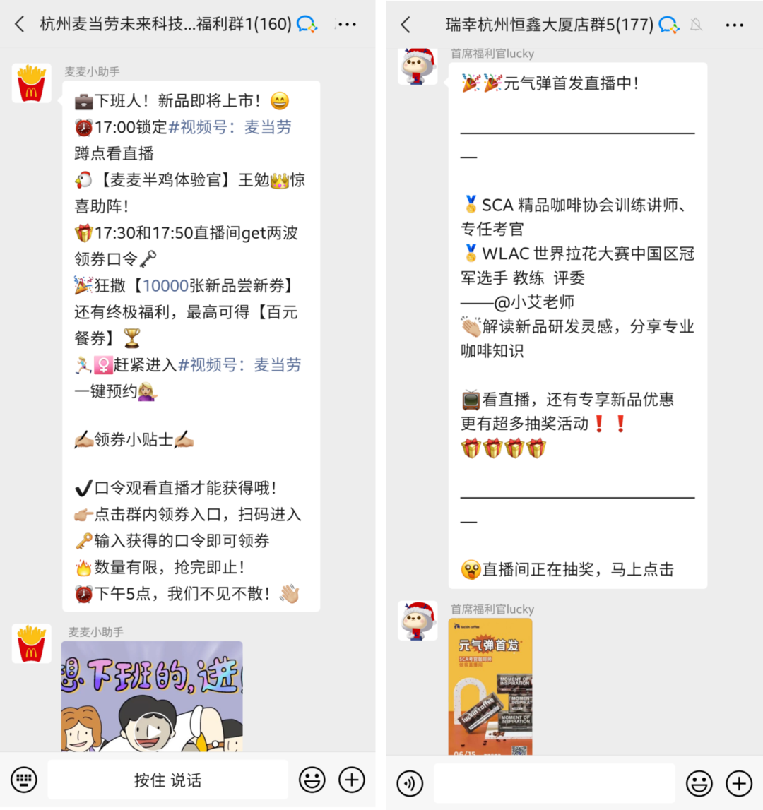 因此呢,麥當(dāng)勞每天會在普通上班族用餐時間段提前一點(diǎn):早上8:00、中午11:00、下午17:00,在群內(nèi)推薦產(chǎn)品,并配上產(chǎn)品海報,以及相應(yīng)的優(yōu)惠,引導(dǎo)小程序下單。