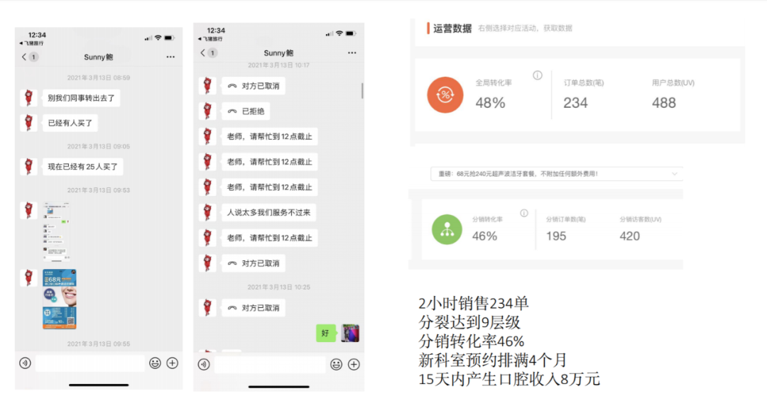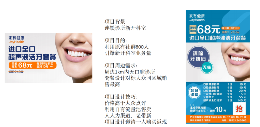 本文內(nèi)容源自零一直播欄目「私域訪談室」,每周四晚 8 點(diǎn),我們都會(huì)邀請(qǐng)到一位源自不同行業(yè)的私域操盤(pán)手,為我們分享他對(duì)所處行業(yè)的思考觀察,以及操盤(pán)私域的經(jīng)驗(yàn)。本期我們邀請(qǐng)了上海焙壹增長(zhǎng)創(chuàng)始人 、南洋國(guó)際醫(yī)療 CMO 邵爺,分享他在醫(yī)療行業(yè)做社群的一些經(jīng)驗(yàn)與洞見(jiàn),以及如何通過(guò)社群使得診所門(mén)診量翻 3 倍、營(yíng)收 2 倍增長(zhǎng)的一些心得。在大眾過(guò)往的認(rèn)知里,診所都是等用戶有需求來(lái)的,很少聽(tīng)說(shuō)有做社群和私域。我們需要去底層邏輯來(lái)看,本質(zhì)上是大家認(rèn)為醫(yī)療的嚴(yán)肅性、依從性不適合在社群里面去展現(xiàn),難以把控?;诖?,結(jié)合我們自己的操盤(pán)經(jīng)驗(yàn),我們總結(jié)了幾個(gè)關(guān)鍵點(diǎn):第一,醫(yī)療行業(yè)做社群在拉新的成本比較低。尤其以口腔和醫(yī)美行業(yè)來(lái)說(shuō),普遍在營(yíng)銷推廣上面的投入都非常充足。為了把控精準(zhǔn)度,本身我們?cè)谧龌鶎俞t(yī)療社群的時(shí)候,就只會(huì)在整個(gè)門(mén)店的 3 公里以內(nèi)拉新的用戶。多數(shù)門(mén)店本身就在周邊社區(qū)里,附近的人都認(rèn)識(shí),有信任基礎(chǔ)就有轉(zhuǎn)化效率。同時(shí)在正常情況下,人只有在生病時(shí)候才會(huì)接觸到醫(yī)生。社群的價(jià)值在于和用戶建立生活性的鏈接,通過(guò)許多內(nèi)容服務(wù)提升信任度,基于此提高用戶對(duì)醫(yī)生的依從性,實(shí)現(xiàn)轉(zhuǎn)化效率的提升。醫(yī)療行業(yè)比任何行業(yè)都看重口碑的傳播。類似“某某診所這個(gè)醫(yī)生看病還不錯(cuò),一次就能把我的感冒看好了”,又比如“之前去了一次就讓我的頸肩這里不痛了”。有了這些反饋,他的人帶人傳播是非常精準(zhǔn)且高效的。補(bǔ)充我們一個(gè)額外的發(fā)現(xiàn),如果你服務(wù)好了一個(gè)家庭的寶寶,你就基本綁定了這個(gè)家庭。當(dāng)你的整個(gè)的醫(yī)療機(jī)構(gòu) or 診所滿足以下任意 2 個(gè)點(diǎn)時(shí)候,你就可以去考慮做社群了:像常規(guī)的感冒咳嗽發(fā)燒拉肚子,通過(guò)這種小的剛需性產(chǎn)品跟客戶產(chǎn)生基礎(chǔ)鏈接。3)利潤(rùn)率、復(fù)購(gòu)率高的產(chǎn)品 or 服務(wù)整個(gè)的服務(wù)項(xiàng)目周期較長(zhǎng),一旦他多次出現(xiàn)在你的社群里面,復(fù)購(gòu)率會(huì)自然變高,雙方鏈接就會(huì)更加頻繁與緊密。4)購(gòu)買(mǎi)決策周期長(zhǎng)比如像亞馬遜口腔內(nèi)向種植是屬于高客單的,決策周期是非常長(zhǎng)的,會(huì)受很多因素影響。在建立社群的時(shí)候,一旦他長(zhǎng)期待在里面,浸泡在專業(yè)內(nèi)容的環(huán)境中,信任感會(huì)自然上來(lái),決策周期就會(huì)縮短,這是一個(gè)非常重要的點(diǎn)。很多中醫(yī)、艾灸也屬于高客單,適合做私域的,本質(zhì)上它不僅高客單,更是一個(gè)高頻產(chǎn)品。 03 分銷轉(zhuǎn)化率達(dá) 46% 口腔診所裂變復(fù)盤(pán)這場(chǎng)活動(dòng)除了分銷轉(zhuǎn)化率在 46%,持續(xù)過(guò)程間的 15 天累計(jì)新增了 8 萬(wàn)的營(yíng)收。該門(mén)店是連鎖型的基層醫(yī)療小診所,本身已經(jīng)有一些固定客戶,社群客情維護(hù)得非常好。因?yàn)樾枰卣剐聵I(yè)務(wù),需要拉升營(yíng)業(yè)額利潤(rùn),基于該前提他去新開(kāi)了一個(gè)口腔科室。我們首先做了調(diào)研,打開(kāi)了 APP 去看的時(shí)候,他診所周邊一公里是沒(méi)有口腔診所的,所以我們?cè)谠O(shè)計(jì)這個(gè)套餐的時(shí)候是對(duì)標(biāo)了大眾點(diǎn)評(píng)同區(qū)域的銷售量最高的這個(gè)產(chǎn)品去做的,算是踩中一個(gè)空白區(qū)域。社群最初的啟動(dòng)量在 800 人左右,但是不一定 100% 都是你這個(gè)項(xiàng)目的目標(biāo)/準(zhǔn)客戶。社群活躍率大概在50%左右,再刨掉一些不精準(zhǔn)的,基本上參與傳播的在 1-200 人左右。這個(gè)項(xiàng)目的成績(jī)主要得益于幾個(gè)關(guān)鍵動(dòng)作:1)本身門(mén)店的服務(wù)是非常極致的,信任度、依從性都很強(qiáng),基礎(chǔ)好2)包裝要到位好。我們?cè)O(shè)計(jì)這張海報(bào)的時(shí)候,和設(shè)計(jì)說(shuō)一定要找一個(gè)牙齒很白的女性照片。買(mǎi)這個(gè)產(chǎn)品的很大一部分人是女性,這是基于我們?cè)谏缛汉椭苓叺挠脩粽{(diào)研,女性占比是非常高的,也會(huì)更加重視自己的外在形象、露齒笑是否是一口白牙。產(chǎn)品選擇上強(qiáng)調(diào)全進(jìn)口的超聲波解壓套餐,海報(bào)里面把所有的洗牙流程全部寫(xiě)到海報(bào)里面去,讓客戶感受到給我的東西足夠超值,價(jià)值感才是驅(qū)動(dòng)下單的本質(zhì)。此外就是對(duì)無(wú)痛的強(qiáng)調(diào),許多人對(duì)洗牙會(huì)有刻板印象,需要一些基礎(chǔ)認(rèn)知教育,這點(diǎn)的強(qiáng)調(diào)其實(shí)意外的重要。其實(shí)這次產(chǎn)品本身不是很特殊,更關(guān)鍵是設(shè)計(jì)醫(yī)療產(chǎn)品套餐時(shí)候,會(huì)重點(diǎn)關(guān)注它是否適合深入的做裂變,因?yàn)樵谧隽炎兊臅r(shí)候一定要考慮它可傳播性。醫(yī)療領(lǐng)域有一些產(chǎn)品由于敏感性,是根本沒(