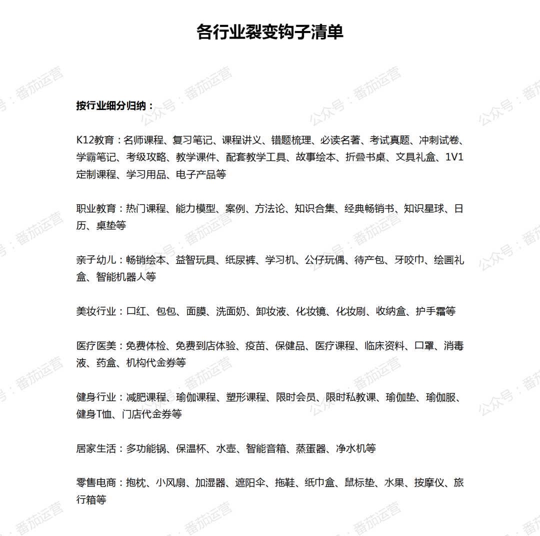 在形式上,實體物品看得見、摸得著,比虛擬產(chǎn)品,獲得感更強。以下是不同行業(yè)的鉤子推薦清單,可以參考、借鑒。