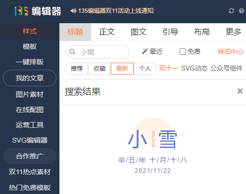 本次上新的小雪樣式,一共21個。包含正文、標題、圖片、軸線、二維碼等多種樣式,在135編輯器內(nèi),搜索關(guān)鍵詞:小雪,即可使用。