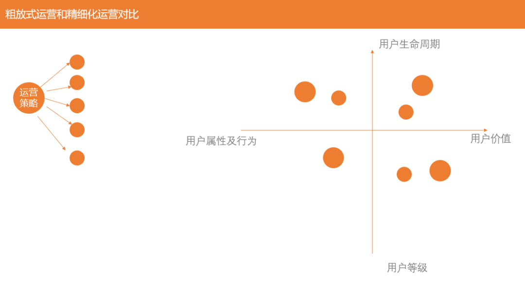 和精細(xì)化運(yùn)營(yíng)相對(duì)的是粗放式運(yùn)營(yíng),也就是在早期的時(shí)候,大部分會(huì)采用的一種運(yùn)營(yíng)方式。大家看到的東西都是一樣的,根據(jù)大眾最終的實(shí)驗(yàn)效果去反饋運(yùn)營(yíng)策略。