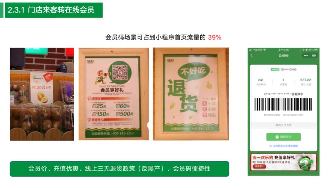 第一,盡快引入會(huì)員。以百果園為例。百果園是一個(gè)水果店,但好在我們很早就開始推充值,而推充值本身給用戶就建立一個(gè)印象:百果園跟普通的水果店不太一樣。