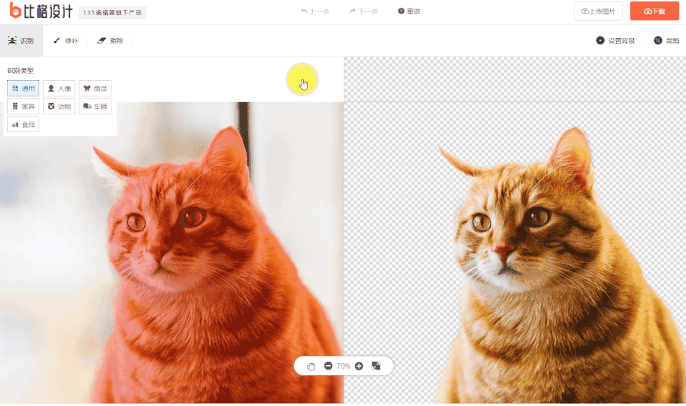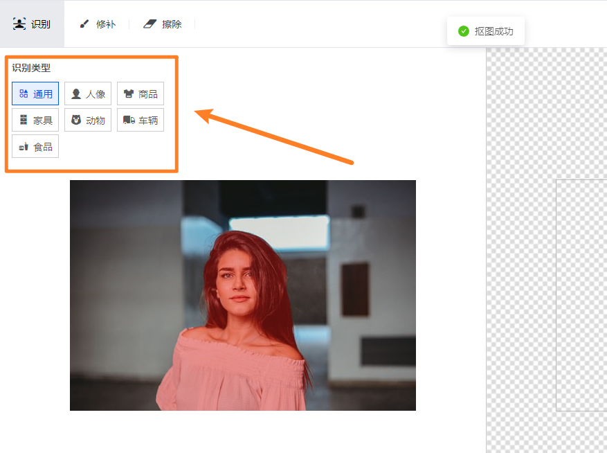 當(dāng)系統(tǒng)識(shí)別有偏差的時(shí)候,可以在左上角的識(shí)別選項(xiàng)中選擇圖片對(duì)應(yīng)的主體,讓摳圖更加精確;