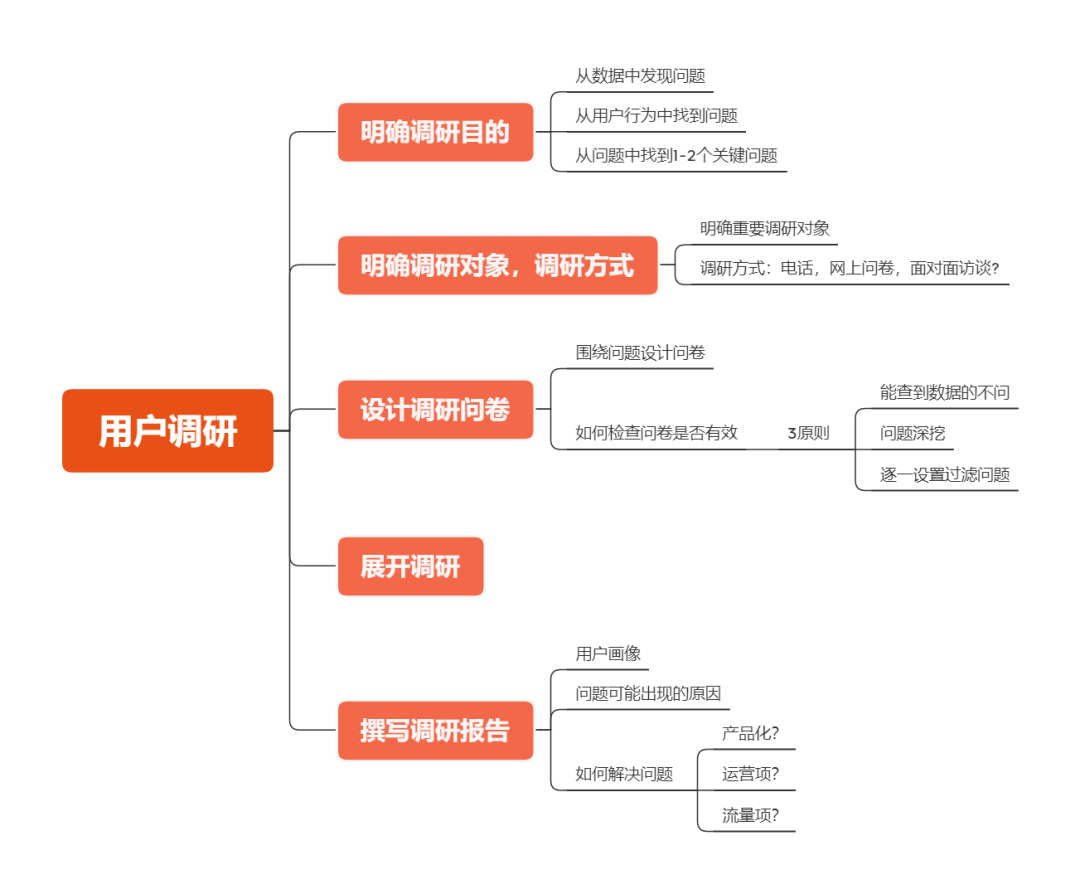 于是說做就做,你就開始著手做用戶調(diào)研。別小看用戶調(diào)研這個(gè)事情,真正做好這件事情,才能從用戶的口中了解更多更有用的信息,從用戶的視角幫忙我們更好地完善產(chǎn)品,提升產(chǎn)品的數(shù)據(jù)指標(biāo)。關(guān)于用戶調(diào)研,主要會從以下幾個(gè)部分入手,如下圖: