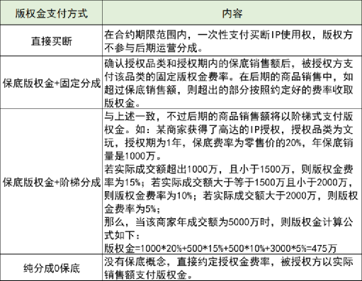 IP版權(quán)金/版權(quán)金費(fèi)率的多少,與授權(quán)內(nèi)容直接相關(guān)。這不難理解,如果你要獨(dú)家/排他,并且涉及商品SKU類(lèi)別、渠道、區(qū)域及授權(quán)時(shí)間范圍越大的話(huà),肯定要求支付的版權(quán)金越高。橘列出幾種常見(jiàn)的IP授權(quán)模式,請(qǐng)看下圖: