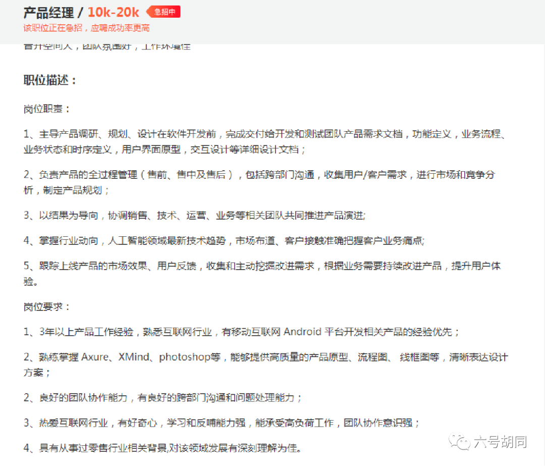 我嘗試了一下去搜索產(chǎn)品經(jīng)理的崗位,這是出來的第一個崗位,它上面還標(biāo)了一個急招,我就把這個崗位的一個描述拿出來看了一下。