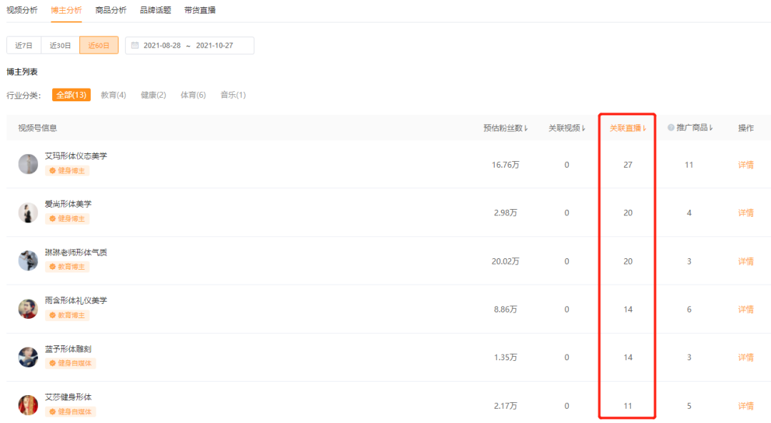 點(diǎn)開詳情,可以看到涉及的博主涵蓋了美食、情感、母嬰育兒等9個(gè)行業(yè)共21個(gè)博主。