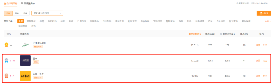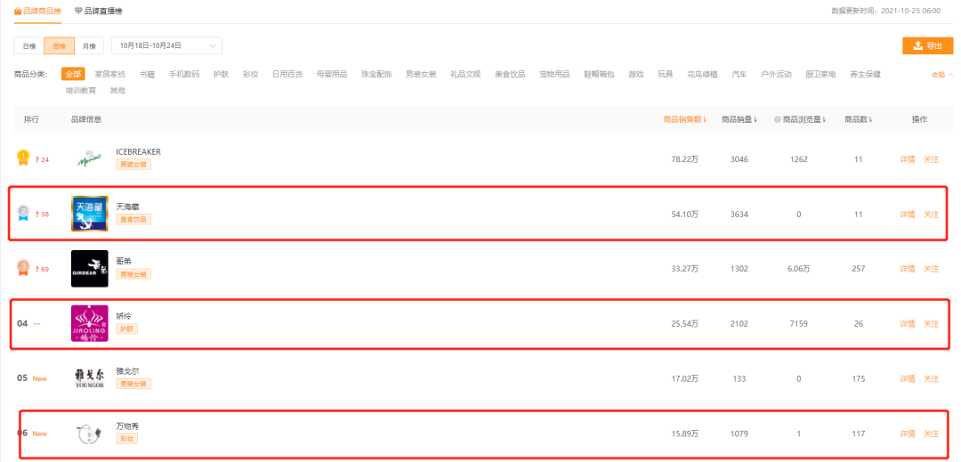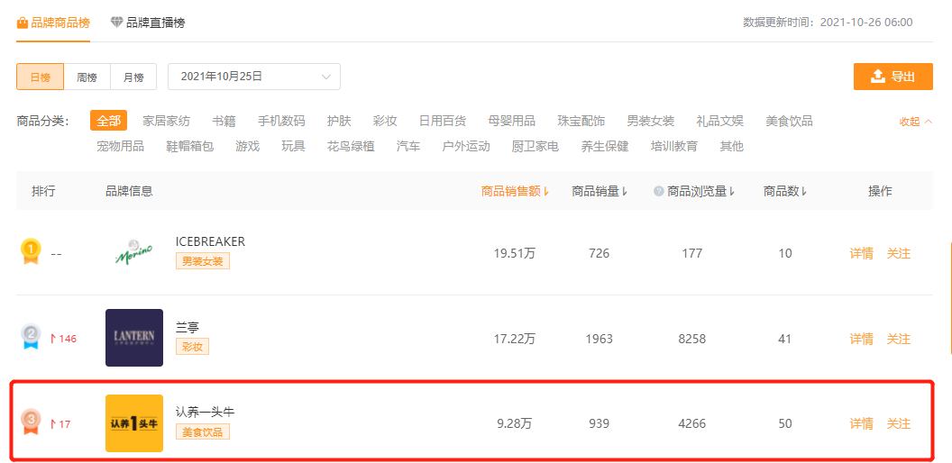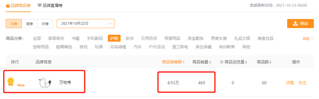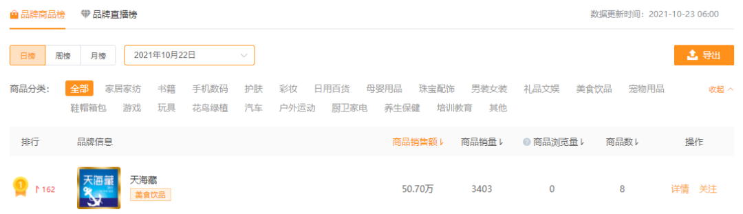 以天海藏品牌為例,這是一個(gè)食品品牌。它在10月22日的日榜中,以商品銷量3403、商品銷售額50.70萬位居榜首。