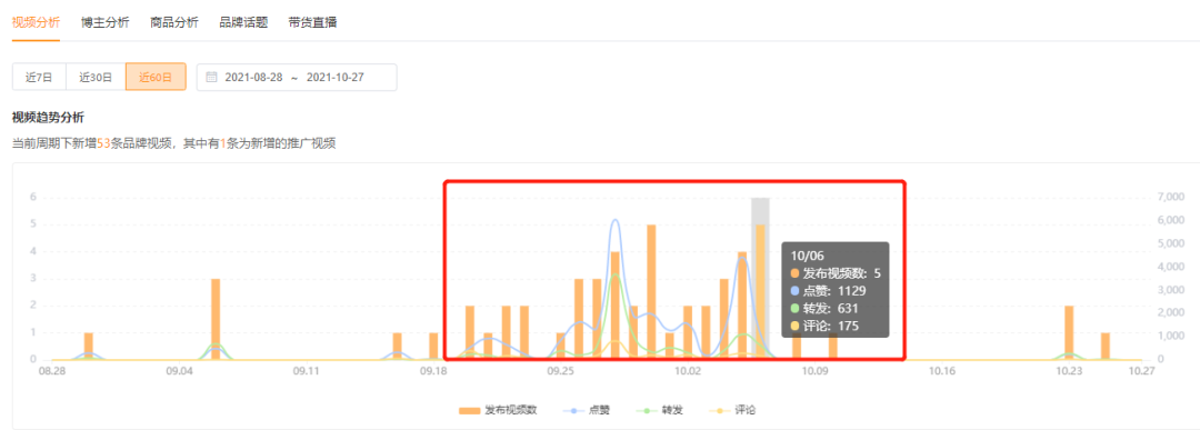 我們在該品牌的詳情頁發(fā)現(xiàn),9月18日-10月6日之間,有較多與品牌相關(guān)的視頻。