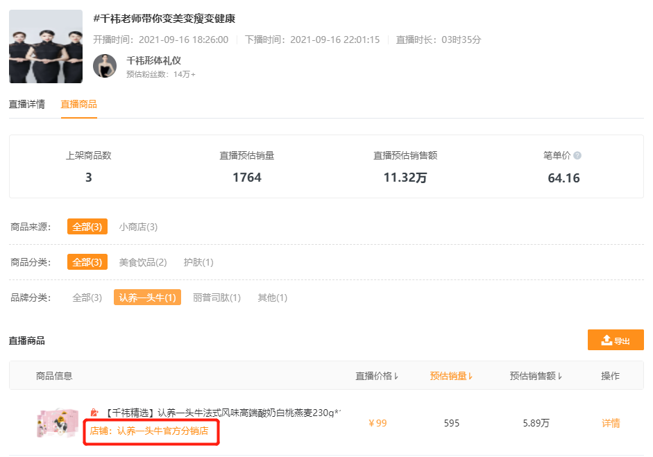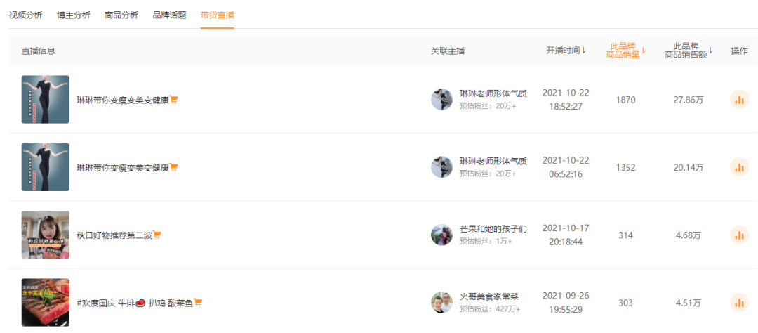 通過【帶貨直播】記錄可以發(fā)現(xiàn)這款商品帶貨較好的是琳琳老師形體氣質(zhì),22日當(dāng)天2場的銷量均超過1000。