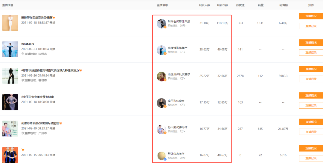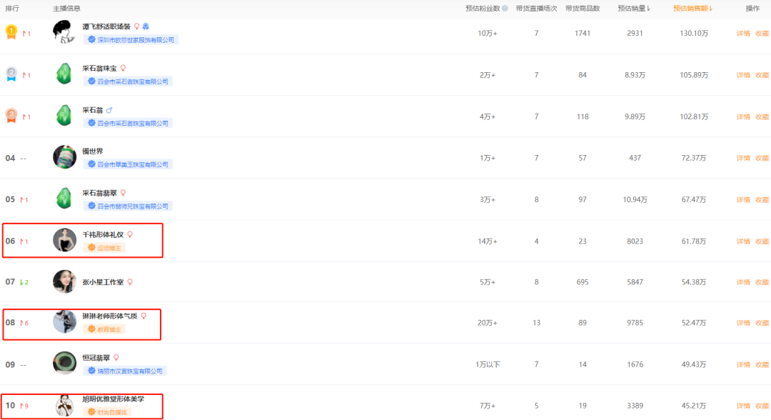 在直播帶貨周榜中,這些形體禮儀教學(xué)的博主也時長躍進(jìn)總榜前十,周帶貨預(yù)估銷售額也有大幾十萬。