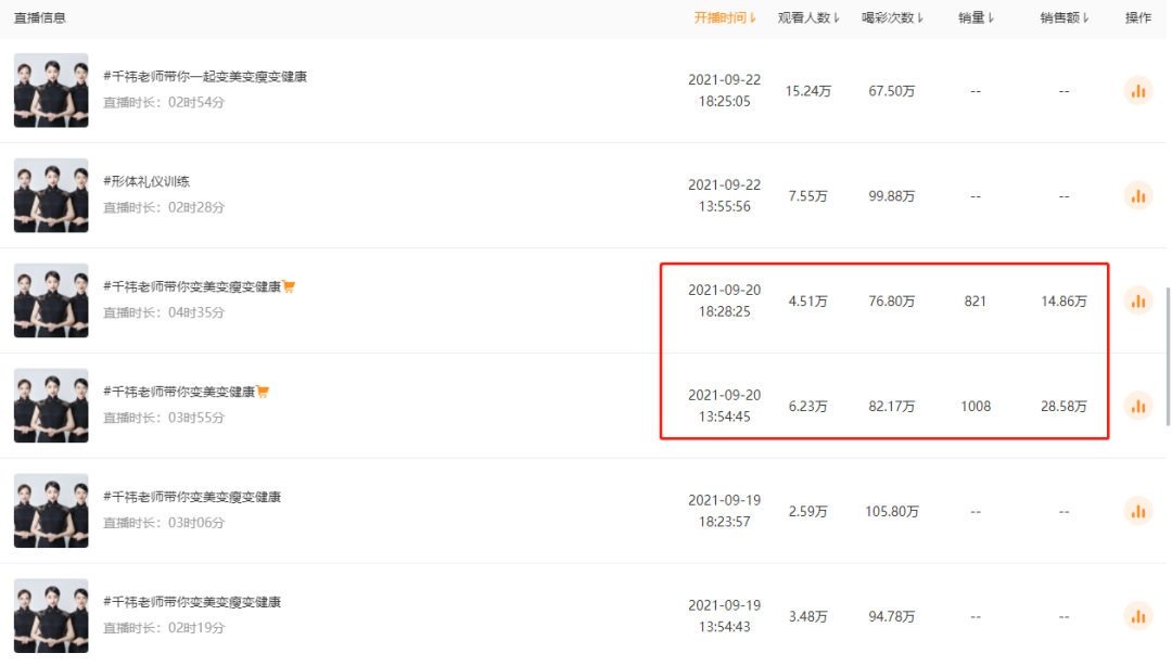 從詳細(xì)的直播記錄中可以看到,千祎形體禮儀并非每一場直播都帶貨,而是不定期地在直播中進(jìn)行帶貨。