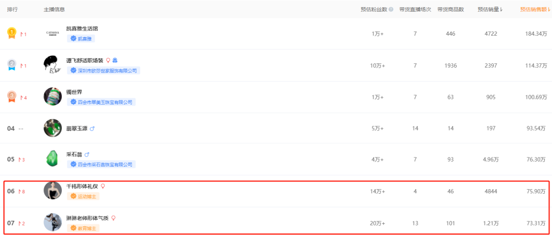 在最近一周(9月20日-9月26日)的直播帶貨榜中,千祎形體禮儀和琳琳老師形體氣質(zhì)排名分別是第6和第7,均比上周有所上升。