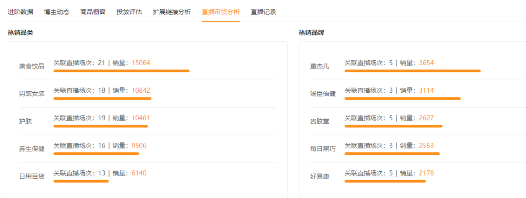 從千祎形體禮儀的【直播帶貨分析】可以看到,她的熱銷品類為美食飲品、男裝女裝、護(hù)膚、養(yǎng)生保健、日用百貨等,熱銷品牌如湯臣倍健、好易康等。