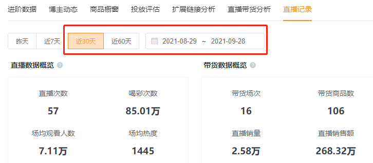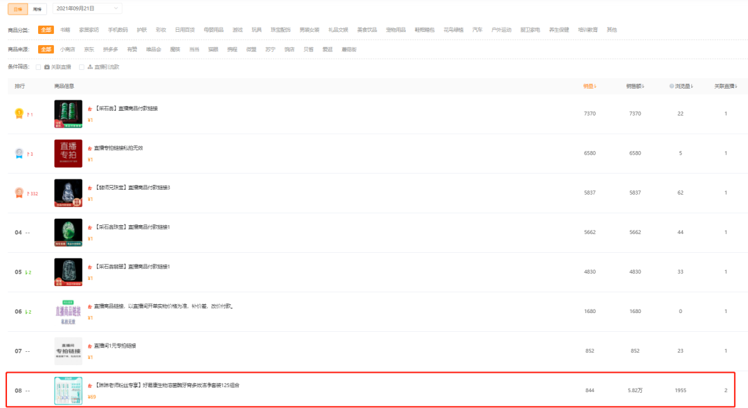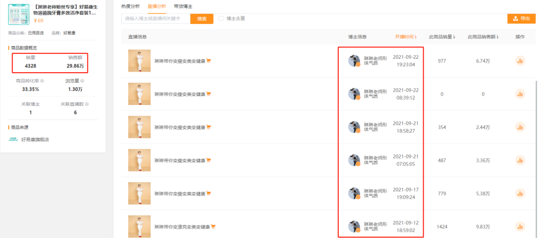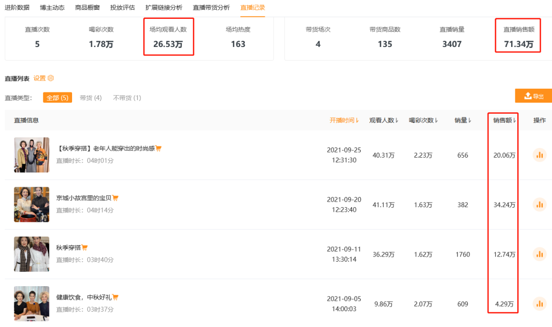 我們可以看到,在9月20日的兩場直播中,雖說觀看人數(shù)都沒有過10萬,但是當(dāng)天帶貨銷售額累計超43萬。