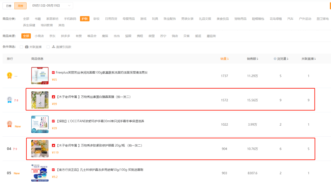 我們又查看了周榜發(fā)現(xiàn),在護(hù)膚類目下,排行前5的商品中有兩個是【木子老師專屬】標(biāo)題字樣的商品,是來自木子面部瑜伽博主的帶貨商品。而其他三個均是來自央視新聞中秋百億補貼專場。