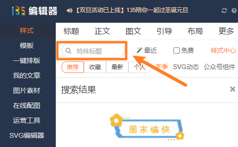在135編輯器內(nèi),搜索樣式ID或關(guān)鍵詞:特殊標(biāo)題,點(diǎn)擊樣式,即可將樣式添加到編輯區(qū)域的文章中使用。