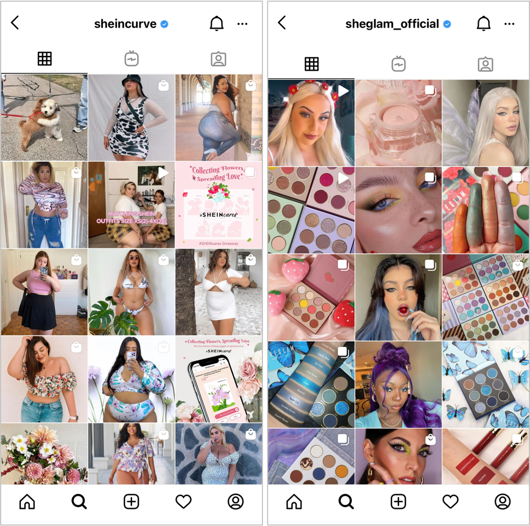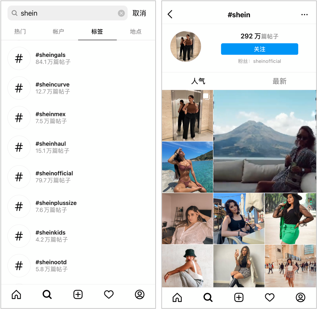 第三招,則是對(duì)于不同的品類設(shè)立專門的賬號(hào),分享垂直化內(nèi)容。比如 @sheincurve 這個(gè)賬號(hào)里主要分享的是大碼女裝,@sheglam_official 針對(duì)美妝類產(chǎn)品做內(nèi)容。第四招,則是利用社交媒體上的標(biāo)簽功能,促進(jìn) UGC 優(yōu)質(zhì)內(nèi)容的產(chǎn)出。在 INS 上,僅 #shein 一個(gè)話題的產(chǎn)出就有 292 萬篇帖子,基本都是用戶們穿著 SHEIN 的衣服在各地拍的 ins 風(fēng)格的照片。04