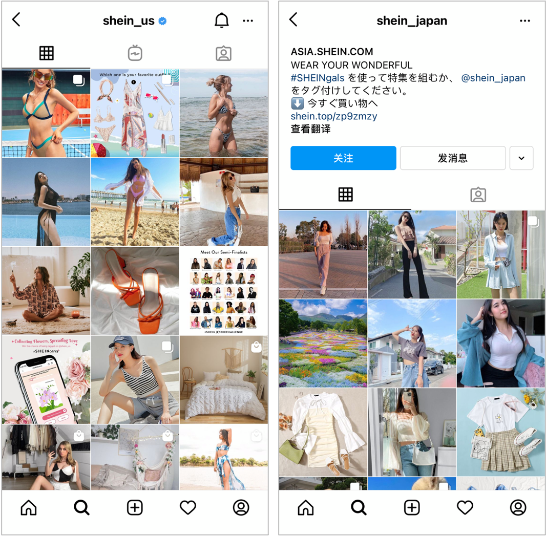 第二招,則是針對(duì)不同的國家和地區(qū),都有相對(duì)更「本土化」的風(fēng)格。比如,美國、日本、加拿大、西班牙都有單獨(dú)的子賬號(hào),它們的風(fēng)格也更貼近本國人民審美。比如,SHEIN 美國賬號(hào) @shein_us 里發(fā)布的服裝風(fēng)格更加開放,姿勢也會(huì)更大膽;而日本的賬號(hào) @shein_japan 中的服裝風(fēng)格就相對(duì)甜美,更多使用亞裔模特,且模特姿勢比較拘謹(jǐn)。