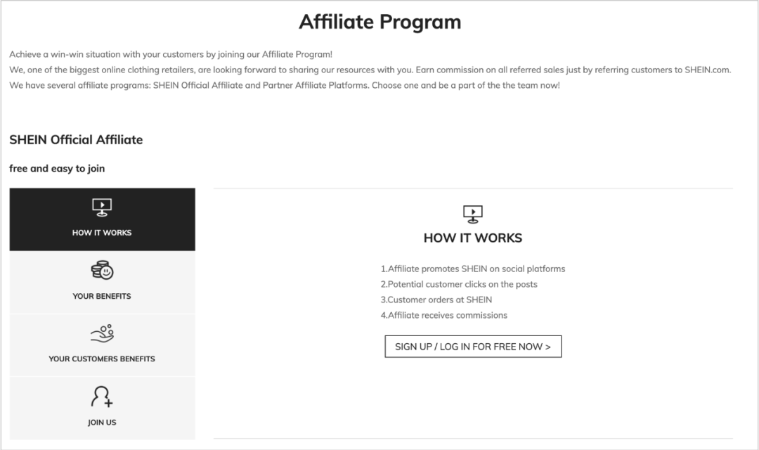 有著中國基因的 SHEIN 將網(wǎng)紅經(jīng)濟(jì)那一套復(fù)制到海外,實(shí)現(xiàn)了降維打擊。SHEIN 早在2011年,就開始利用網(wǎng)紅推廣市場。品牌沒有選擇成本更高的KOL(關(guān)鍵意見領(lǐng)袖)來宣傳,而是選擇規(guī)模較小、影響力較大的KOC(關(guān)鍵意見消費(fèi)者)來獲得更大的曝光量。這些 KOC 在海外主流社交媒體平臺(tái)比如 YouTube、Instgram、Tik ToK(海外版抖音)、Facebook 講述自己的購買和穿搭經(jīng)歷,以此吸引更多的消費(fèi)者。從 SHEIN 的招聘信息,就可以看出他們在網(wǎng)紅營銷上的策略。他們會(huì)主動(dòng)在不同的社交媒體渠道去聯(lián)系大V,自主開發(fā)并聯(lián)系紅人,尋求合作。同時(shí)也會(huì)通過發(fā)樣品、紅人營銷、廣告打造爆款。維護(hù)已經(jīng)達(dá)成合作的紅人,及時(shí)解答他們的疑問。據(jù)報(bào)道,一個(gè)在 Instagram 擁有 36000 名關(guān)注者的大學(xué)生稱,“如果我把自己在SHEIN買的東西發(fā)布到個(gè)人賬號(hào),SHEIN 每個(gè)月將給我六件商品的免費(fèi)額度?!?/span>憑借 KOC 網(wǎng)紅營銷模式,SHEIN 迅速打開了美國年輕人的市場。深諳互聯(lián)網(wǎng)營銷玩法的 SHEIN 同時(shí)采取了「聯(lián)盟營銷」策略, 吸引用戶去自發(fā)購買衣服,讓其做測評(píng)視頻來賺錢傭金。我們很容易在 SHEIN 官網(wǎng)找到 Affiliate (聯(lián)盟)的入口,這樣做的好處是,讓聯(lián)盟客直接找到其項(xiàng)目,而非需要到處去尋找。將其中一部分有賺錢想法的用戶或者網(wǎng)紅,加入到 SHEIN 自營的聯(lián)盟項(xiàng)目,逐漸變?yōu)樗接蛄髁康囊徊糠?,從而進(jìn)一步擴(kuò)大自己的銷售空間和銷售渠道。