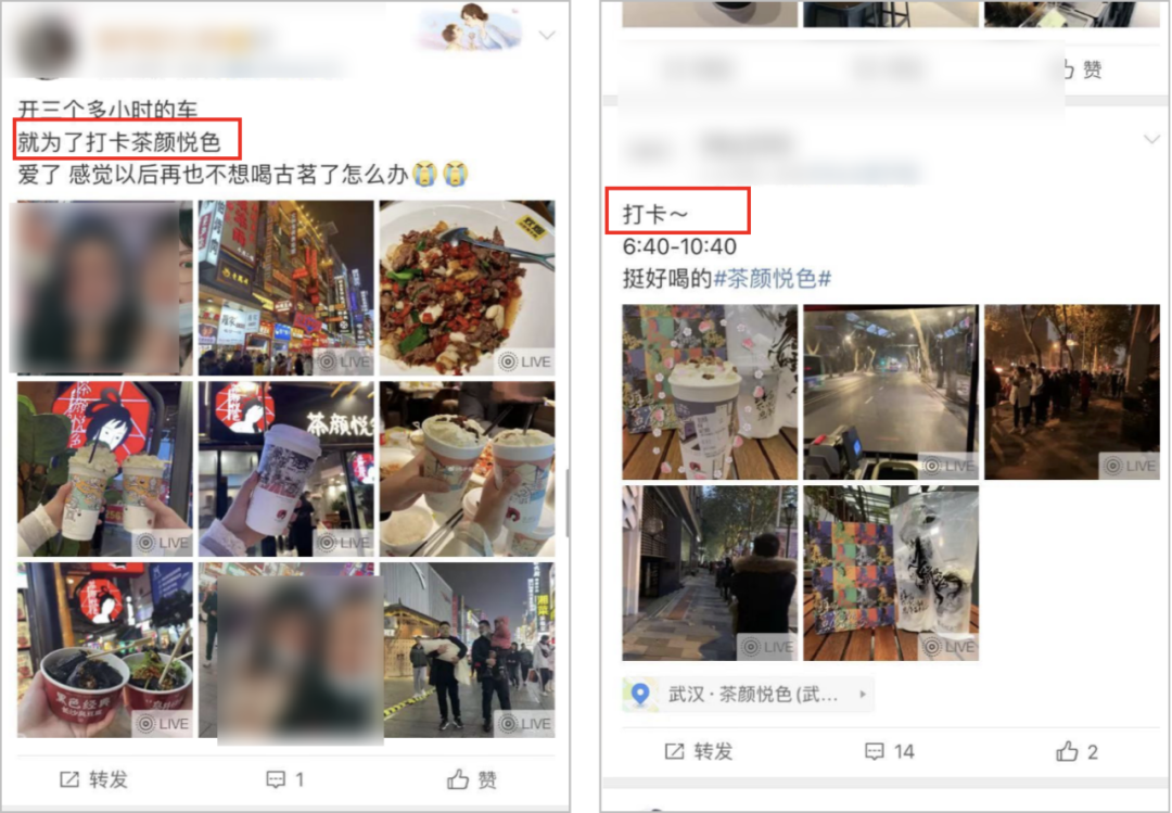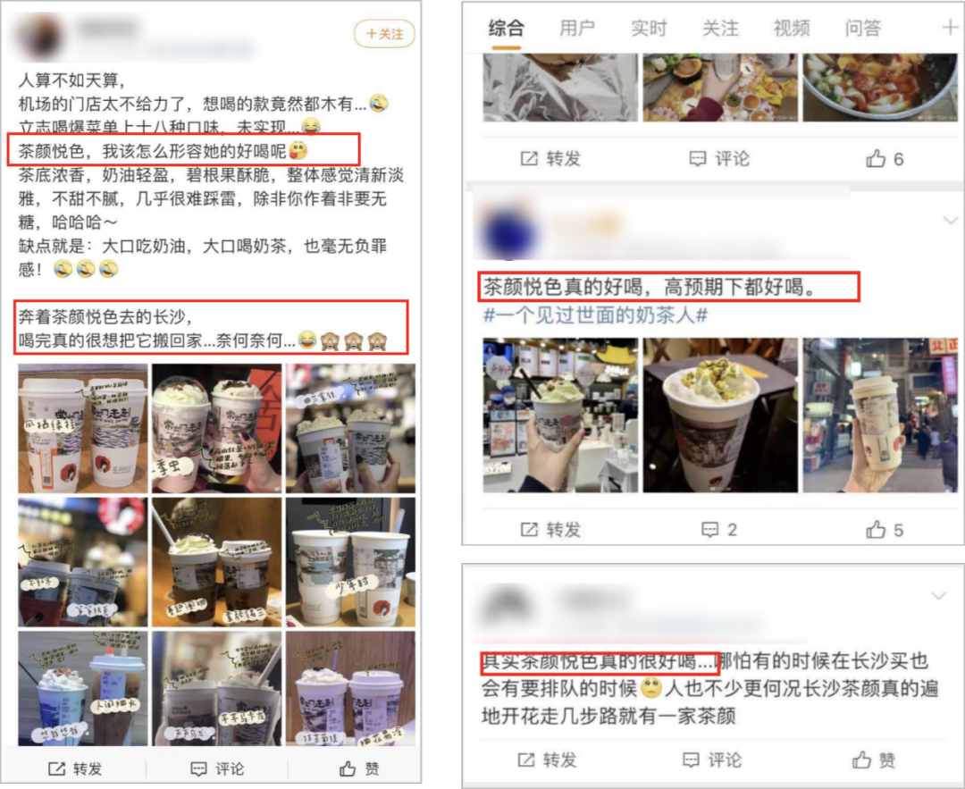 無(wú)論是有心還是無(wú)意,總之茶顏有了一大批死忠粉,他們會(huì)像為愛(ài)豆打 call 一樣,自發(fā)為其賣(mài)力宣傳。2)被“饑餓營(yíng)銷(xiāo)”:只開(kāi)在長(zhǎng)沙講真,雖然茶顏不輕易開(kāi)出長(zhǎng)沙是因?yàn)榻M織能力跟不上,但是,這其實(shí)也給茶顏帶來(lái)了相當(dāng)?shù)挠懻摱取?/span>為什么呢?相比喜茶、奈雪的茶,茶顏悅色在社交媒體上的討論度更高。這是因?yàn)椋?/span>茶顏的「成圖率」很高,比喜茶、奈雪的茶都要高。「成圖率」是咖啡品牌三頓半提出的一個(gè)概念,就是指用戶(hù)購(gòu)買(mǎi)后,主動(dòng)拍照在社交平臺(tái)分享的比率。為什么茶顏的成圖率高呢?因?yàn)椴桀亹偵母邿岫?,以及它的稀缺?/span>(只在長(zhǎng)沙有),引發(fā)了一波又一波“媒介朝覲”(即受社交媒體的宣傳,自己親自去往現(xiàn)場(chǎng)的行為)。對(duì)于很多人,尤其是游客來(lái)說(shuō),打卡到一杯只有長(zhǎng)沙才有的網(wǎng)紅奶茶,這份稀缺性已經(jīng)值在社交平臺(tái)上分享了。