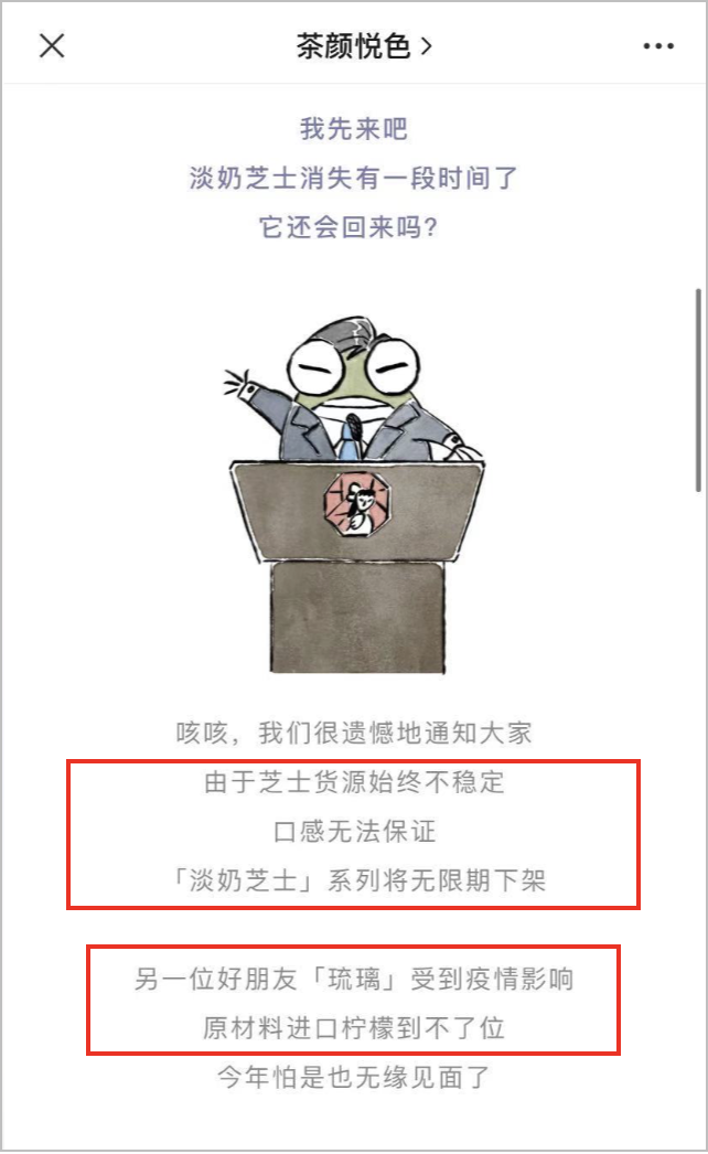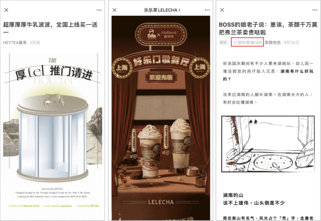 這些行為,幾乎都是粉絲的主動(dòng)操作,可以說(shuō)和茶顏官方毫無(wú)關(guān)聯(lián)……最后,茶顏的品牌形象非?!敖拥貧狻?,和總被相提并論的喜茶、奈雪的茶等品牌都相去甚遠(yuǎn)。從公眾號(hào)上來(lái)說(shuō),相比喜茶們動(dòng)輒做得像個(gè) H5 一樣的豪華圖文,它的圖文風(fēng)格簡(jiǎn)直可以說(shuō)是“寒酸”,經(jīng)常說(shuō)些家長(zhǎng)里短的:從老板的形象上來(lái)說(shuō),喜茶的老板是個(gè) 90 后潮人、奈雪的茶創(chuàng)始人是都市精致女性,兩個(gè)品牌都估值幾十億美金,外界對(duì)他們的印象一直是“年輕有為,形象光鮮”:而茶顏的老板呂良大專(zhuān)畢業(yè),在員工的描述中,他是一個(gè)羽絨服破了就用電工膠帶粘起來(lái)的大叔,為了規(guī)避堵車(chē),天天騎著電動(dòng)車(chē)在長(zhǎng)大街小巷巡店……在創(chuàng)辦茶顏悅色之前,老板創(chuàng)業(yè)過(guò) N 次:鹵菜店、蓋澆飯館、賣(mài)爆米花,統(tǒng)統(tǒng)失敗……