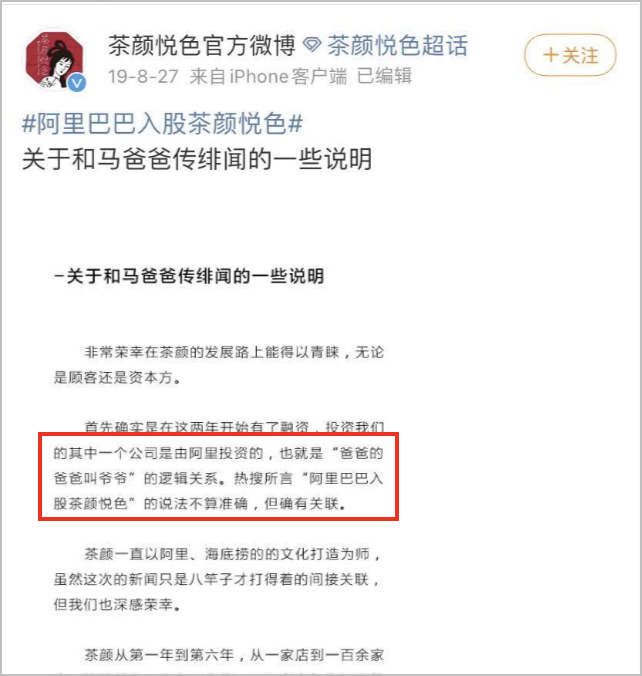 今年七月,茶顏的母公司接受了“阿里投資的公司”的投資,相當(dāng)于阿里間接入股了茶顏,茶顏也在微博上蓋戳認(rèn)證了這件事: