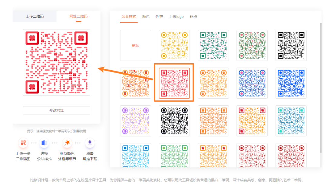 二維碼編輯頁的右側(cè)為大家提供了各式各樣的二維碼公共樣式,任意選擇一個樣式,就可以應(yīng)用在你上傳的二維碼上,并進(jìn)行預(yù)覽。