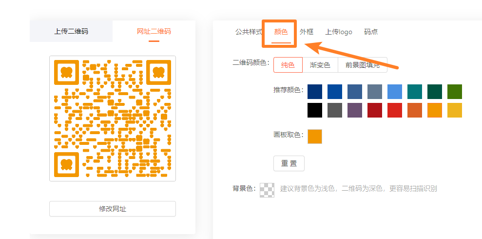 選擇【顏色】選項,根據(jù)排版的顏色,或者品牌主題色來為你的二維碼挑選一個最合適的顏色。