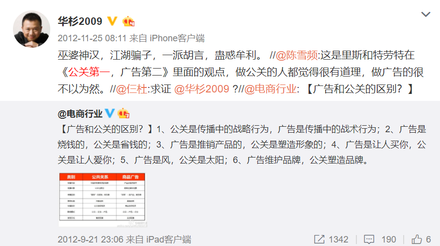 我這樣提及華杉,他肯定也是開(kāi)心的,這就是公關(guān)的妙用。雖然華杉言辭激烈,有失風(fēng)度,但是我們認(rèn)為商戰(zhàn)競(jìng)爭(zhēng)的底線是法律,而不是道德。太看重自己的道德形象是一種內(nèi)部思維。