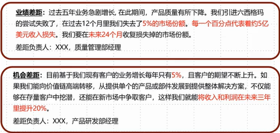 公司經(jīng)營的結(jié)果要和公司既定的戰(zhàn)略目標(biāo)進(jìn)行比較,通過比較才會產(chǎn)生一個差距的描述。在 BLM 模型中,差距一般分為業(yè)績差距和機(jī)會差距,在某些市場競爭激烈的行業(yè)中,企業(yè)往往以標(biāo)桿為驅(qū)動,也稱為對標(biāo)差距。