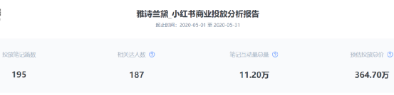 觀察雅詩蘭黛在小紅書的投放數(shù)據(jù),僅在5月份便投放195篇筆記,雅詩蘭黛的投放達人數(shù)量高達187位。5月份,雅詩蘭黛主要用到了彩妝類(34.69%)、穿搭類(32.65%)、護膚類(15.31%)、去處/旅行(7.14%)的達人,預估5月份小紅書投放金額高達365萬。
