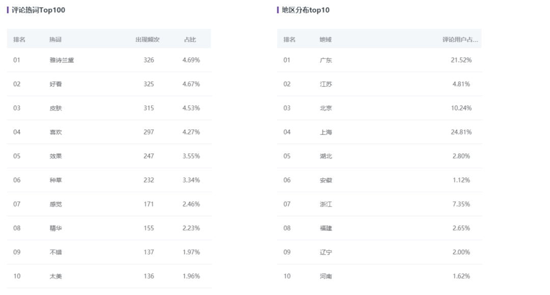 從TOP10點贊和TOP10評論的筆記標題來看,種草、開箱、節(jié)日禮物、告白、修復等內容成為TOP10文章內容及標題的核心點。從TOP10熱詞可得出結果,用戶對于(人/物)美麗、效果、種草等字眼的出現(xiàn)頻次居高,說明用戶對于產品可以讓人變美、真實產品效果、產品包裝美觀度、大V種草等內容接受度較高。