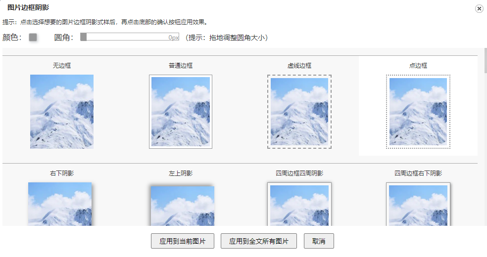 除了添加樣式,選中圖片,在全局設置中找到【邊框陰影】功能,還可以為圖片添加一款你喜歡的基礎邊框,簡單又精致。