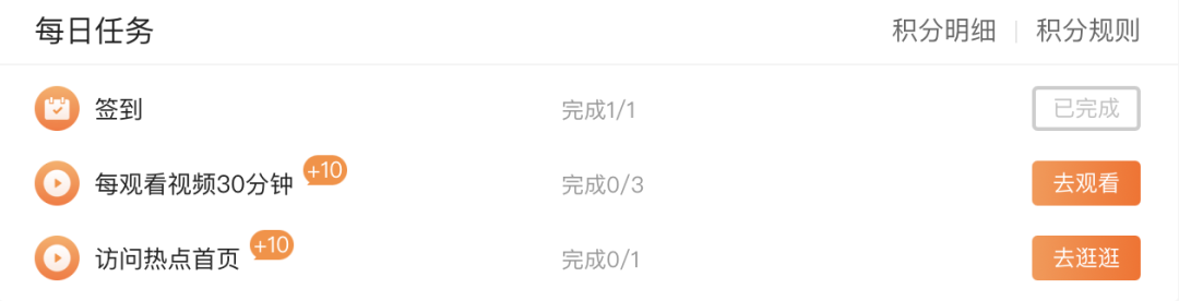 日常任務(wù)包括簽到領(lǐng)積分、登陸領(lǐng)積分、用戶的日?;?dòng)行為等等,此類行為作為用戶主要獲取積分方式,建議此類占總比例30-40%。參考如下: