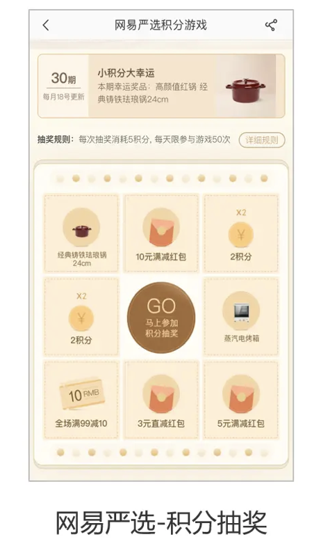 在設(shè)置抽獎(jiǎng)時(shí),需要保證抽獎(jiǎng)的商品有吸引力,利用用戶以小博大的賭徒心理,在玩法中促進(jìn)其積分的消耗。還要保證用戶有一定的中獎(jiǎng)概率,最好確保用戶是100%中獎(jiǎng)。