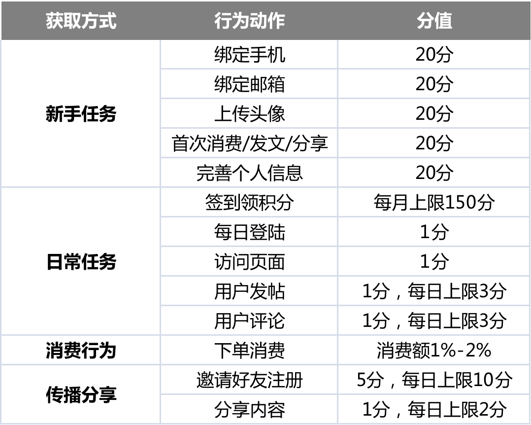 我們要學(xué)會(huì)讓用戶主動(dòng)去獲取積分,保證用戶與品牌的互動(dòng)頻率。另外為了控制成本,在設(shè)計(jì)過(guò)程中要注意兩點(diǎn):第一,羅列用戶行為,根據(jù)行為給出關(guān)鍵權(quán)重;第二,根據(jù)權(quán)重設(shè)計(jì)各個(gè)行為的積分值。