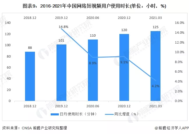 據(jù)中國(guó)網(wǎng)絡(luò)視聽(tīng)節(jié)目服務(wù)協(xié)會(huì)數(shù)據(jù)顯示,截止 2021 年第一季度,中國(guó)短視頻人均單日使用時(shí)長(zhǎng)達(dá) 125 分鐘,較 2020 年 12 月底增加了 5 分鐘,短視頻用戶粘性持續(xù)提升。