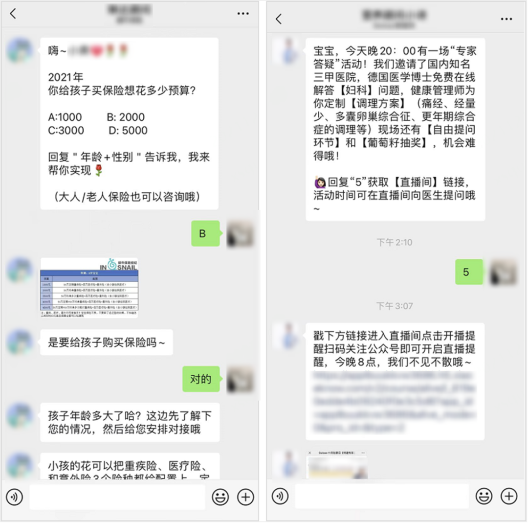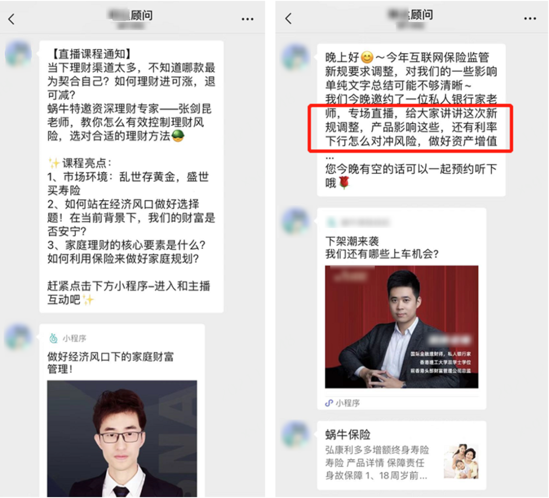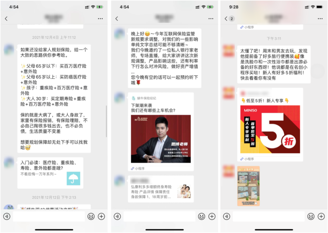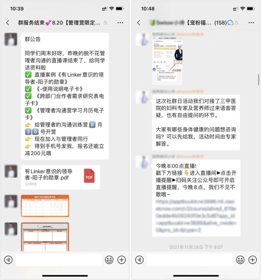 除此之外,我們也可以選擇轉(zhuǎn)發(fā)公眾號文章 + 發(fā)送直播 / 免費課海報給客戶,讓客戶感受到我們?yōu)樗峁┑膬?nèi)容價值,比如某保險的私域運營會時不時發(fā)送保險的內(nèi)容干貨和免費直播,某零售私域運營會通過場景化的內(nèi)容來做轉(zhuǎn)化。