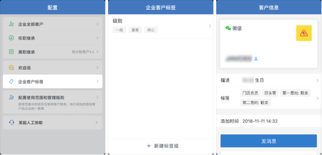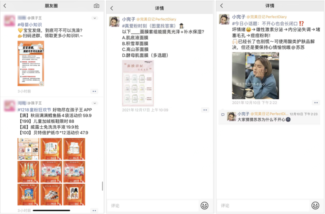 做「滲透式營銷」,企業(yè)微信的朋友圈對于客戶互動來說是個不可或缺的場景。我們可以通過文案、圖文等方式在朋友圈觸達客戶,比如分享干貨知識、活動信息、產(chǎn)品動態(tài)等。企業(yè)微信朋友圈支持添加 2000 個文字,附件可選擇添加 9 張圖片、1 個視頻或網(wǎng)頁消息,成員還添加門店位置等信息,吸引客戶到店。值得一提的是,每位客戶的朋友圈每天可展示每個運營人員的 1 條內(nèi)容,每個月還可展示來自企業(yè)的 4 條內(nèi)容。當(dāng)然,培育期的朋友圈內(nèi)容不宜太頻繁,每天 1-2 條即可。通過企業(yè)微信的「朋友圈功能」,可以將特定內(nèi)容一鍵同步到用戶朋友圈,非常方便。至于具體內(nèi)容,可以按照「滲透式營銷」的三個階段:提升認知——解決方案——方案推薦,提前設(shè)置,到時候直接復(fù)制發(fā)送就可以了,比如孩子王、完美日記等企業(yè)的朋友圈,就是根據(jù)這三個階段安排相應(yīng)的內(nèi)容,有節(jié)奏地在朋友圈分享。